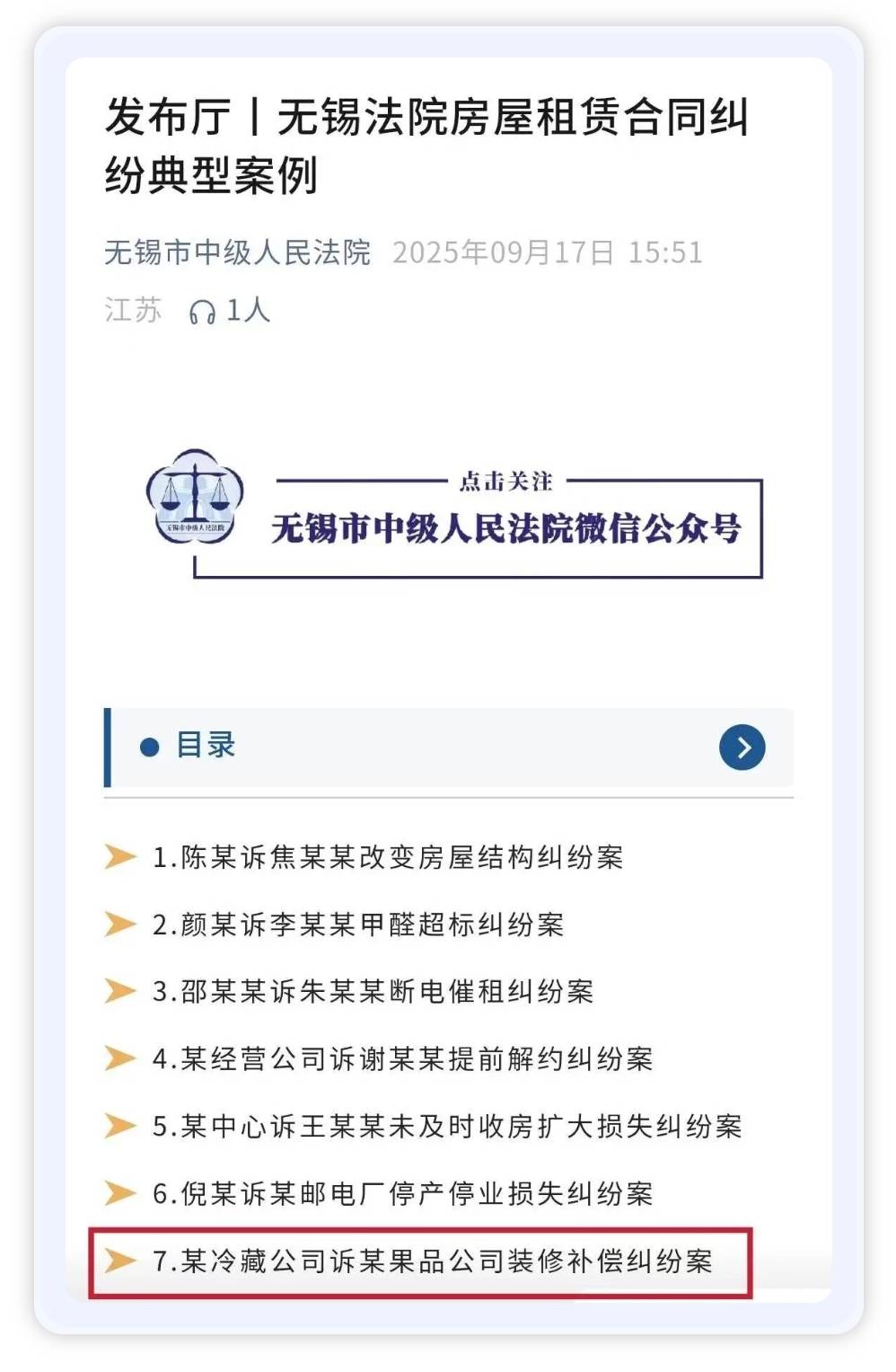 无锡市中级人民法院近日发布“无锡法院房屋租赁合同纠纷典型案例”,梁溪法院审结的“某冷藏公司诉某果品公司装修补偿纠纷案”入选。