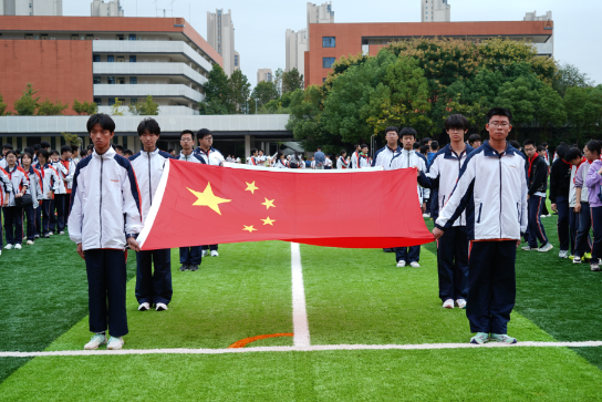入场式上,国旗队迈着整齐步伐率先登场,鲜红的国旗迎风飘扬,彰显着华夏儿女的荣耀与担当;紧随其后的校旗队精神抖擞,旗手们坚定的姿态,传递出学校 “求实、奋进、博学、谦逊” 的校风与 “中国灵魂,世界胸怀” 的育人追求。