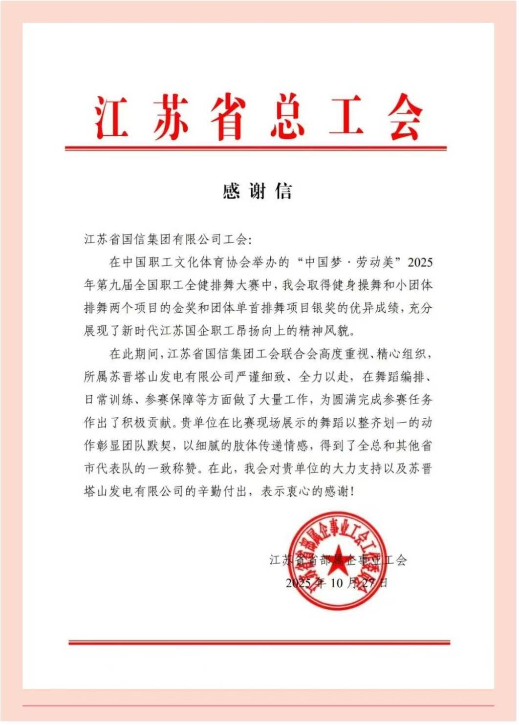 文化国信【职工风采篇】| 江苏省国信集团苏晋塔山发电有限公司在第九届全国职工全健排舞大赛中喜获佳绩