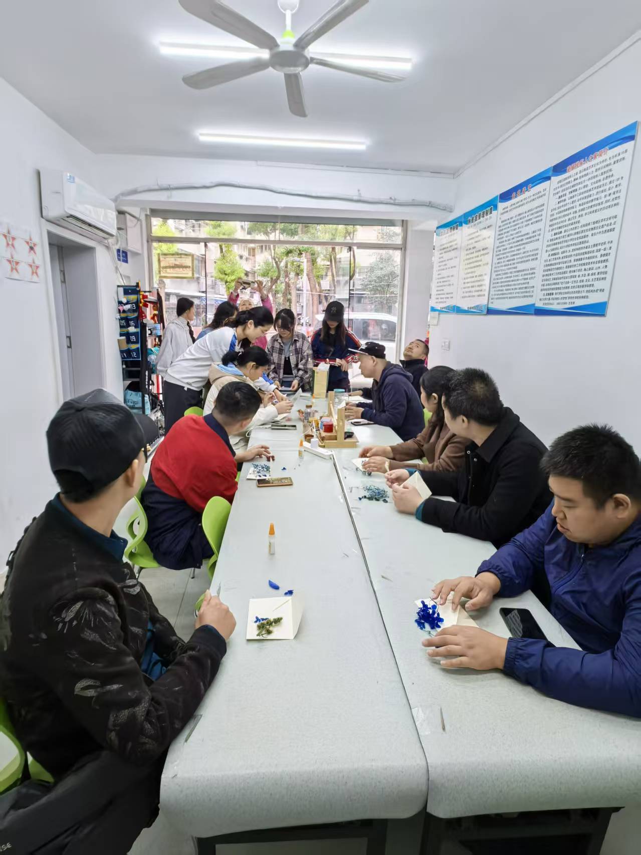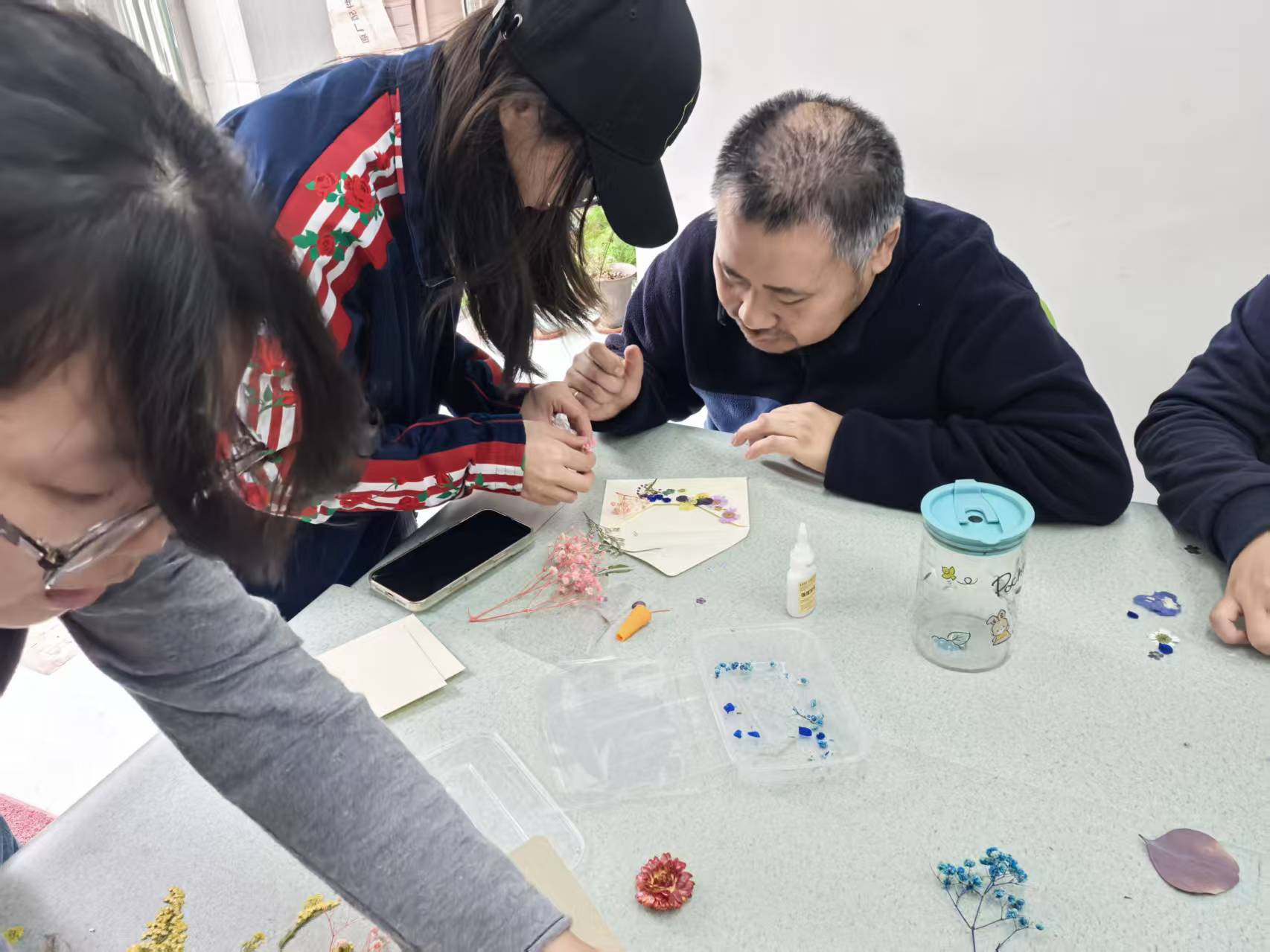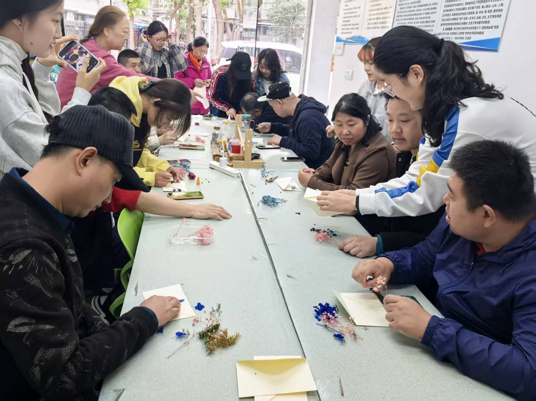 活动现场,志愿者们耐心细致地讲解着信封制作的步骤与技巧。从裁剪纸张、折叠成型,到用干花装饰封面,每一个环节都手把手指导学员操作。学员们全神贯注,跟着志愿者的节奏认真摆弄材料,原本略显生涩的指部动作在反复练习中逐渐灵活,当一个个点缀着素雅干花的独特信封在手中完成时,大家脸上都洋溢着满满的成就感。