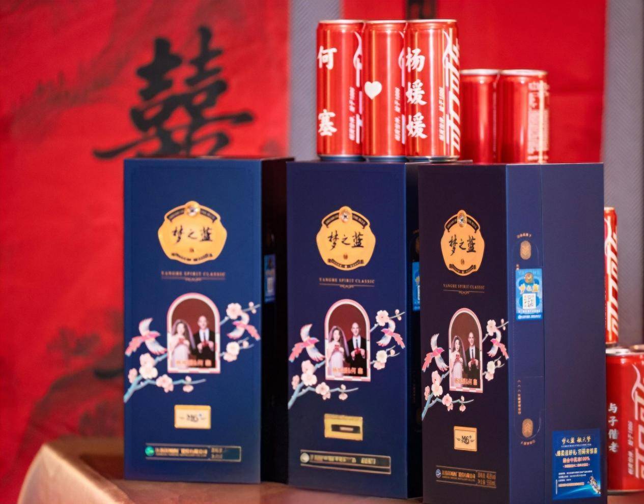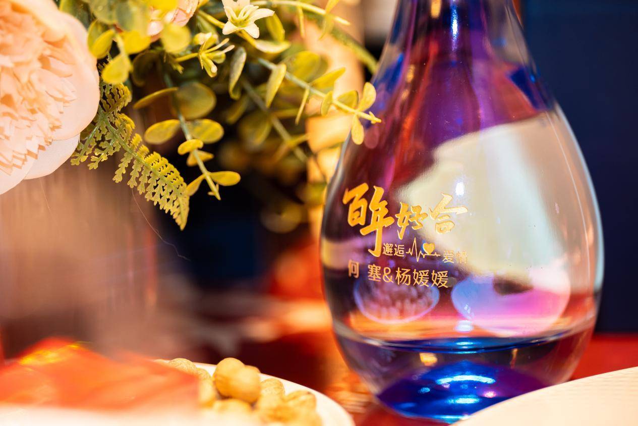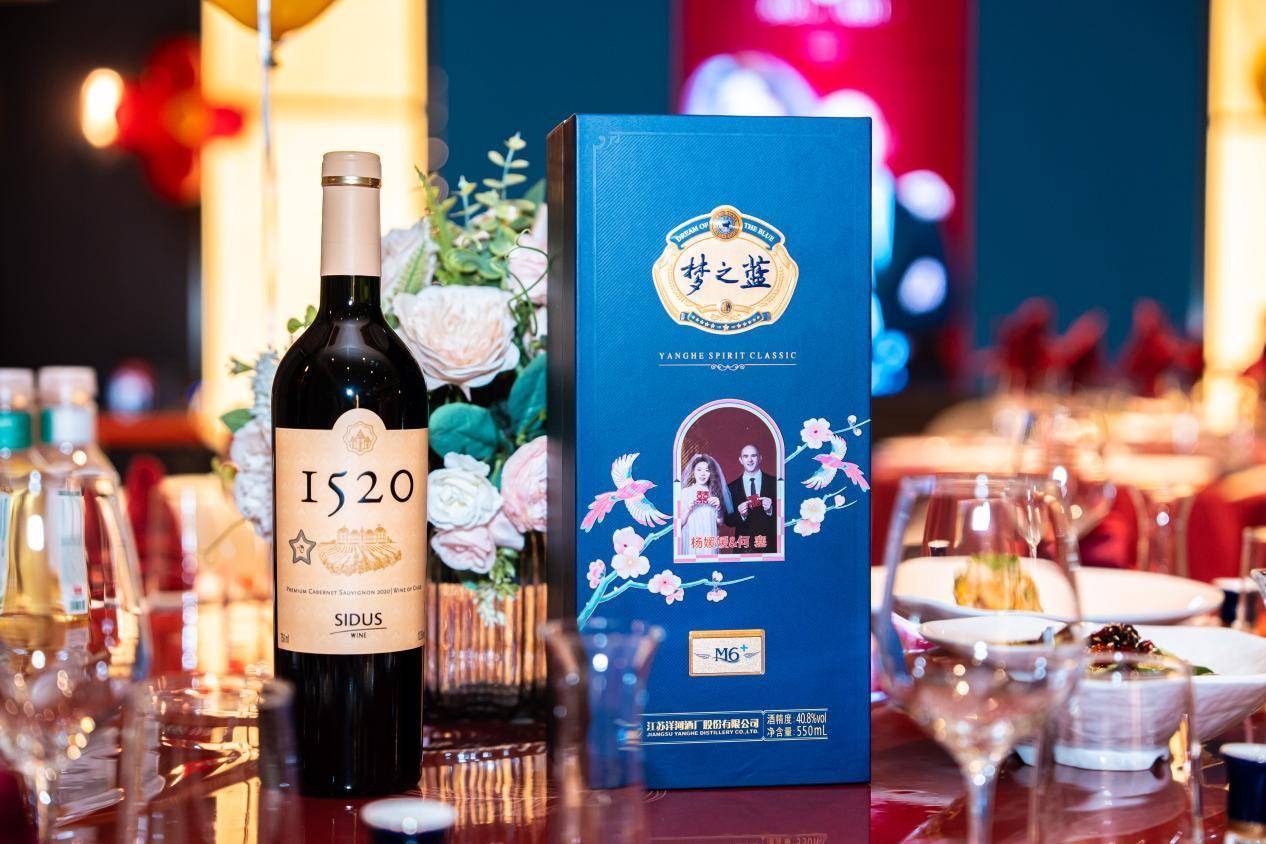 特别定制的梦之蓝水晶版,瓶身晶莹剔透,在灯光下折射出璀璨光芒,映照着两人纯净的爱情。每一瓶都刻有“百年好合何塞&杨媛媛”的烫金字样,与洋河梦之蓝logo交相辉映,成为这场跨国姻缘最诗意的注脚。