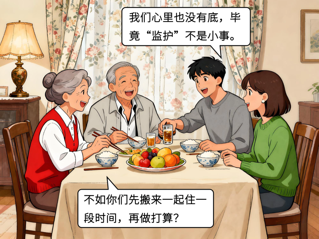在鼓起勇气提出后,两家人坐下来细细商量,都觉得多年来相处得非常愉快,但小李夫妇认为,“监护”不是小事,要将黄老太夫妇的余生托付给自己,他们心里也没有底。于是,黄老太提议:“不如你们先搬来一起住一段时间,再做打算?”小李夫妇表示同意。