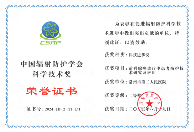 2025年11月12日,中国辐射防护学会2024年度科学技术奖颁奖仪式在广东珠海举行,备受瞩目的科技进步奖评选结果正式揭晓,南京医科大学第三附属医院(常州二院)倪昕晔教授团队的“前列腺癌放疗中患者防护技术研究及应用”项目,荣获科技进步二等奖,该团队也是本届评选中唯一荣获二等奖及以上奖项的医院团队。