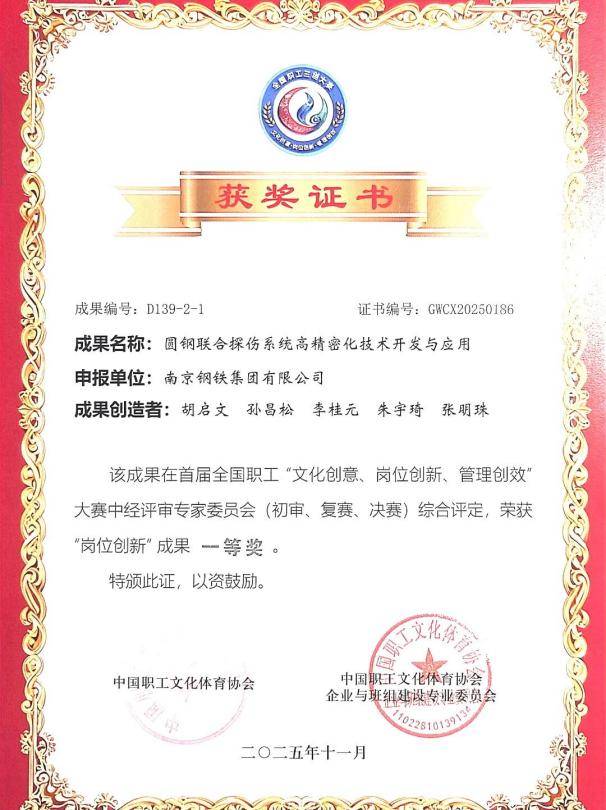 近日,首届全国职工“文化创意、岗位创新、管理创效”大赛总决赛在北京举行,共计572项职工创新项目进入总决赛,其中南京钢铁申报的“圆钢联合探伤系统高精密化技术开发与应用”成果,经初审、复赛、决赛的多轮严苛评审,最终斩获“岗位创新”成果一等奖。
