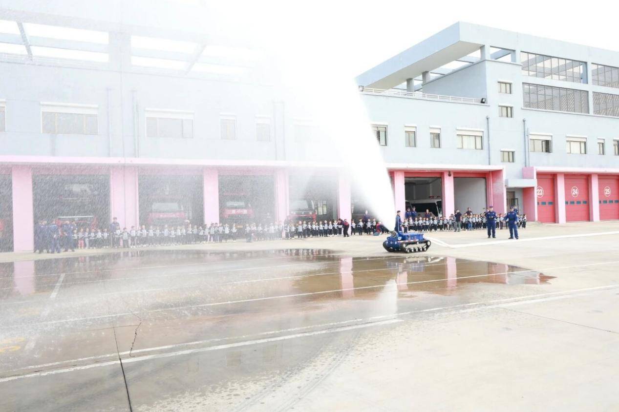 备受小朋友喜爱的装备体验环节紧随其后。消防员展示并详解重型防化服、避火服的功能用途,在专业指导保护下,孩子们兴致勃勃地体验穿戴,真切感受救援装备的厚重与消防员工作的艰辛。此外,师生们还参观了基地各类消防车辆与专业救援装备,指战员以通俗语言介绍其在灭火、抢险救援中的应用,满足了孩子们的好奇心。活动现场,先进的侦检机器人进行出水灭火演示,灵活精准的操作赢得阵阵掌声,彰显了高精尖设备在应急救援中的重要作用。