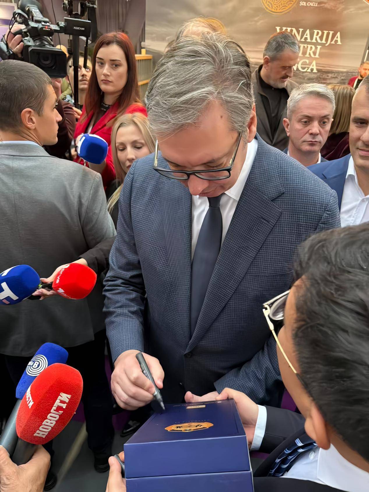 洋河产品独特的绵柔口感与符合国际潮流的美学设计,吸引了现场众多嘉宾。展会期间,塞尔维亚总统武契奇亲临洋河展区,品尝了梦之蓝后称赞绵柔口感“prettygood”,并欣然留下了亲笔签名。