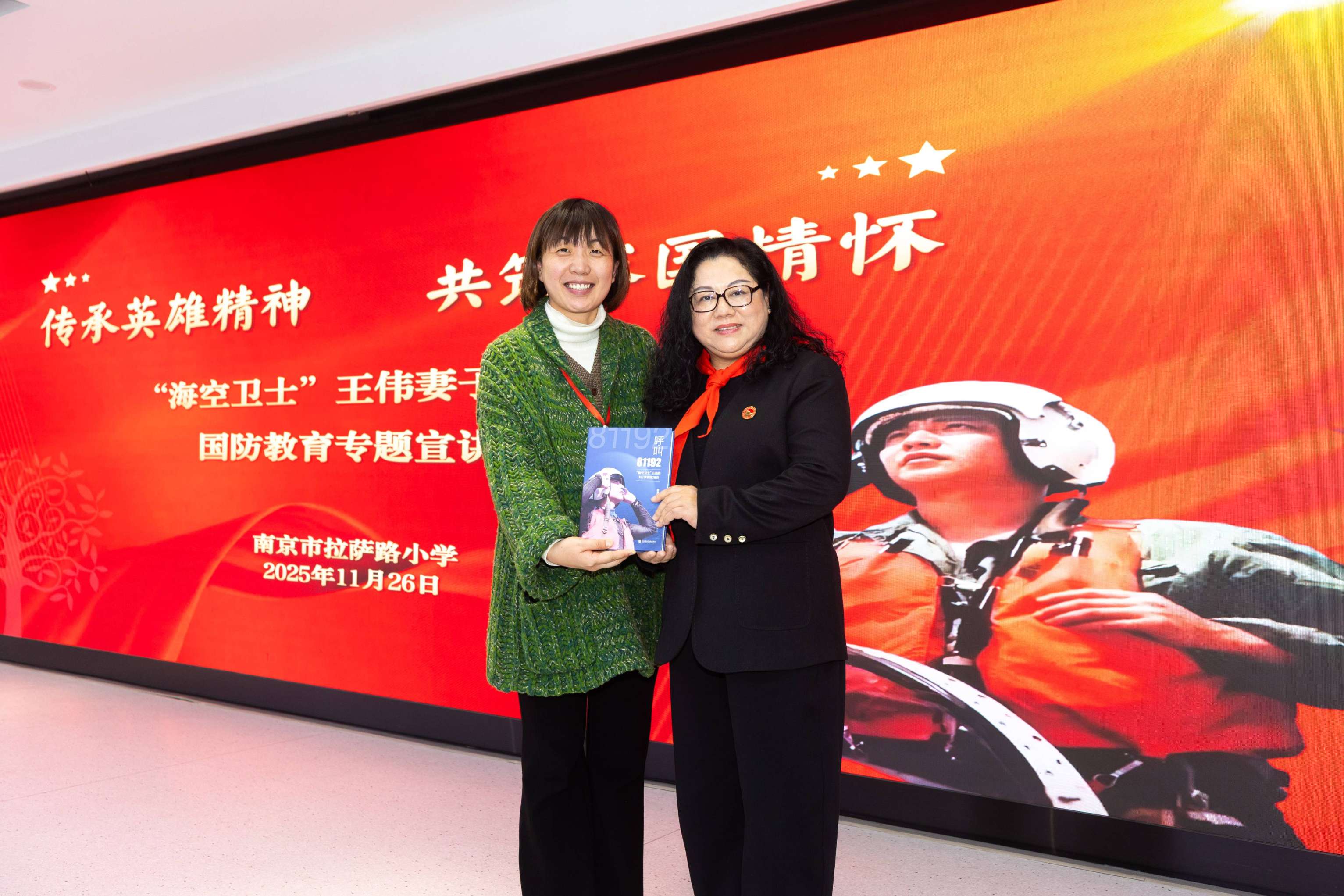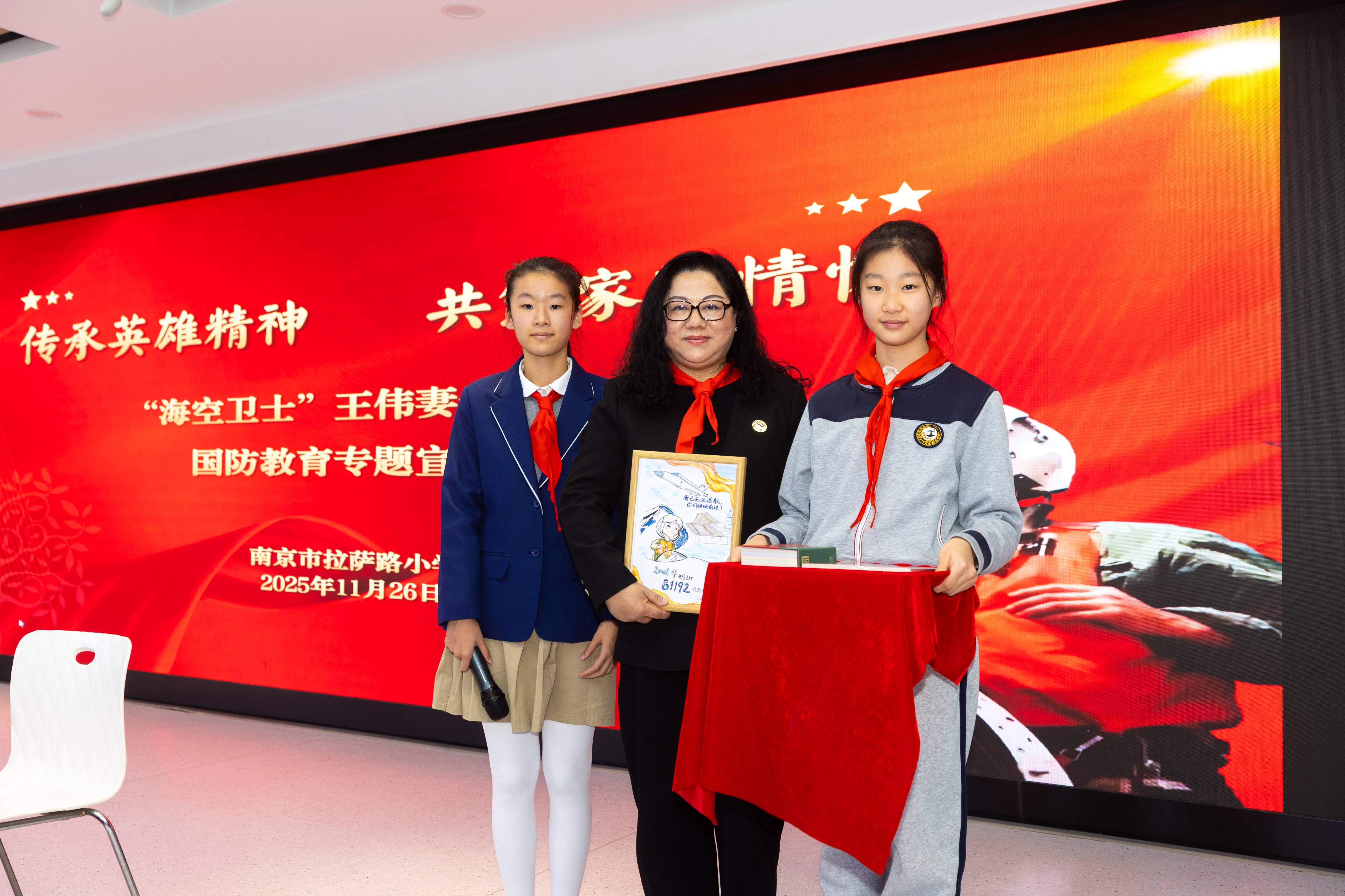 报告结束后,学生代表手捧精心准备的礼物登台。亲手绘制的“海空卫士”王伟英雄画像、手绘《宝贝宝贝》年历、拉小《百步故事》……每一份礼物都承载着拉小师生对英雄的缅怀与对英雄家属的敬意。阮国琴则向学校赠书《呼叫81192》,南京市拉萨路小学校长刘宁代表学校接过书籍时表示:“我们珍藏这本书,让英雄精神融入校园的每一个角落,成为师生们滋养心灵、砥砺前行的精神养分。”