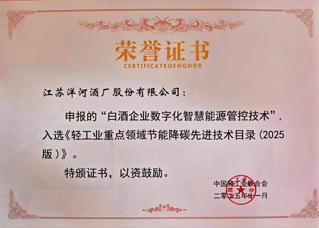 11月11日,由中国轻工业联合会主办的“轻工业科技创新与绿色发展大会”在南京隆重举行。公司凭借在绿色制造方面的突出成果荣膺“2025年轻工行业绿色制造标杆企业”,申报的“白酒企业数字化智慧能源管控技术”入选《轻工业重点领域节能降碳先进技术目录(2025版)》。