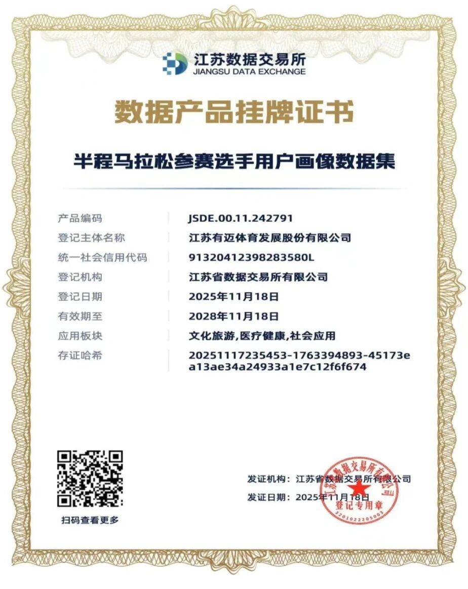 钟楼经济开发区企业江苏有迈体育发展股份有限公司自主研发的《赛事人群配速分布》《半程马拉松参赛选手用户画像数据集》及《迷你跑参赛选手特征分析报告》三款数据产品同步挂牌省数交所。有迈体育在体育赛事运营领域耕耘了11年,已累计承办全国各类马拉松赛事近百场,收集了400多万名运动员的个人健康、运动以及消费等领域的大量数据,作为常州首批挂牌的体育数据产品,它们不仅体现了有迈体育在体育大数据领域的深厚积累,也展示了常州市在推动数据要素市场化配置、促进体育产业与数字技术深度融合方面的前瞻布局。