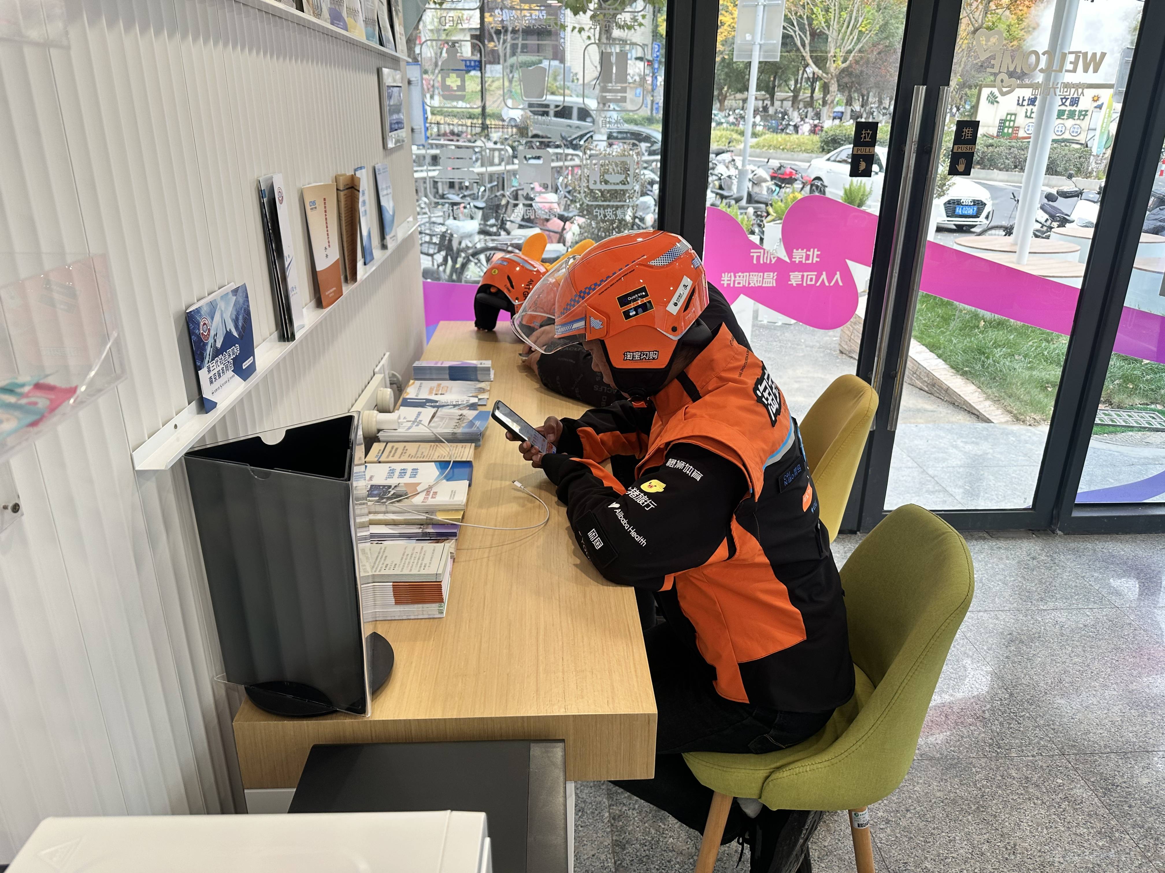 外卖小哥在驿站充电歇脚