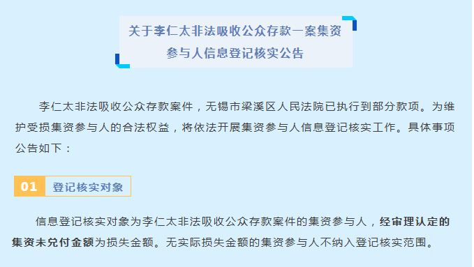 李仁太非法吸收公众存款案件,无锡市梁溪区人民法院已执行到部分款项。为维护受损集资参与人的合法权益,将依法开展集资参与人信息登记核实工作。具体事项公告如下: