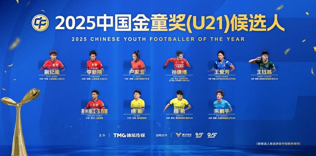 在中国金童奖评选U21组别,以11球荣膺2025赛季中超本土射手王、并收获了国家队生涯首球的王钰栋领衔入选,与其一同出战U20亚洲杯的蒯纪闻、杨希和朱鹏宇,同样在中超赛场汲取经验、崭露头角,他们均得到了“金童”提名。代表U22国家队出战U23亚洲杯预选赛的李新翔、吾米提江·玉苏普和徐彬,本赛季在俱乐部获得了稳定的出场时间。李新翔和吾米提江更是全程助力上海海港先抑后扬的争冠征程。另一位候选人——19岁孙康博在赛季中加盟辽宁铁人农商银行,坐稳主力位置,并在全运会决赛打入了绝平进球。
