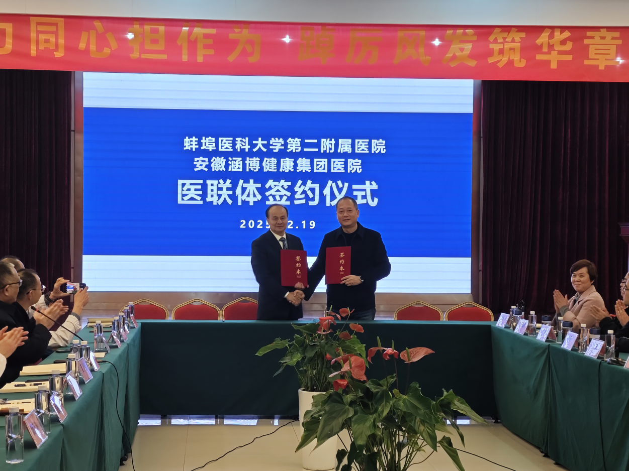 12月19日,蚌埠医科大学第一附属医院、第二附属医院与安徽涵博健康集团医院举行医联体合作签约暨蚌埠医科大学实践教学基地揭牌仪式,标志着双方合作步入实质阶段,将进一步整合优质医疗与教学资源,提升区域医疗服务能力与医学人才培养水平。蚌埠医科大学党委书记朱立军率校院领导及专家团队出席,安徽涵博健康集团医院院长孟庆海携核心骨干共同参与仪式。
