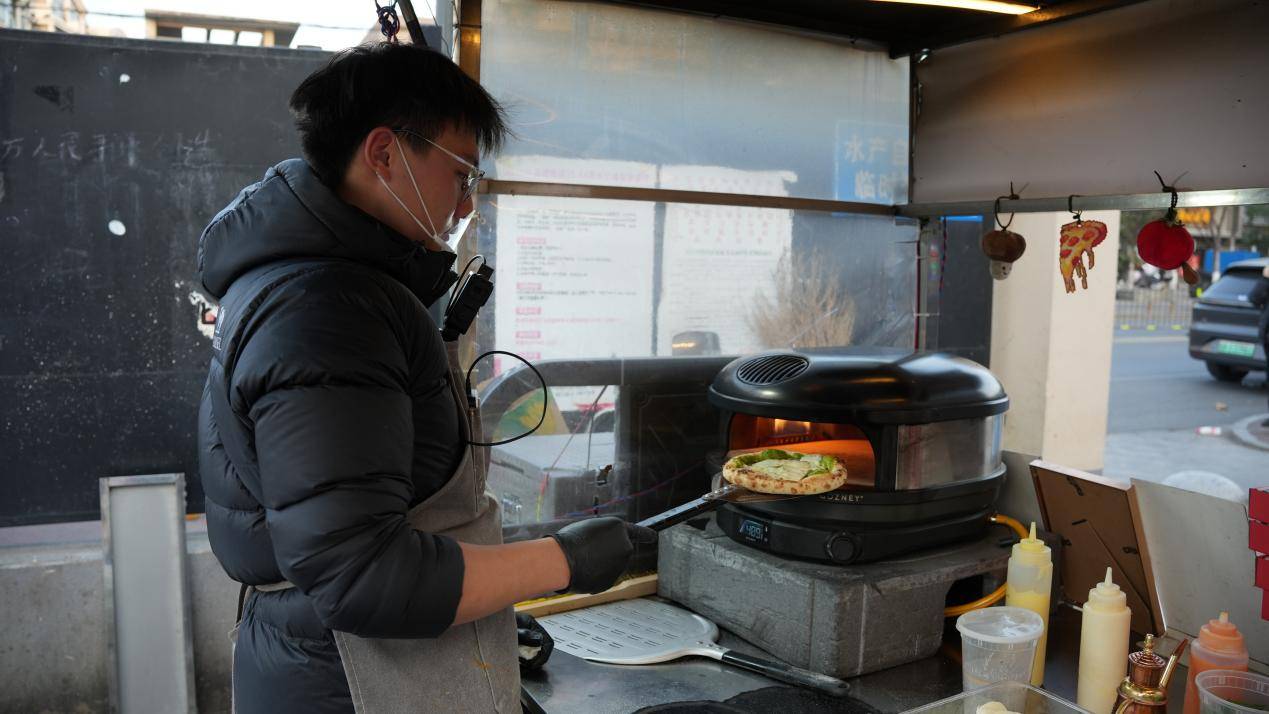 “每天能卖将近200单,最火的时候得排2小时队,一直忙到晚上九点多才收摊。”21岁的小孟在盘城菜场摆摊仅两个月,他揉面、铺料已娴熟利落,双手翻飞间,发酵好的面团转眼就擀成薄厚均匀的饼底。他介绍,摊位主打窑烤披萨,区别于常见的烤箱制作,500℃高温窑炉能快速锁住食材水分,烤出的饼底外焦里软,这般地道口味竟颇受欢迎。