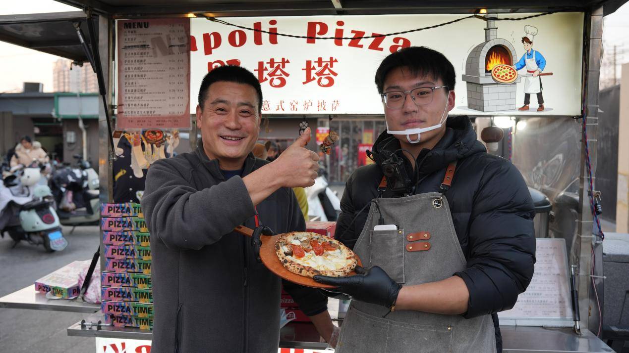 00后的活力,让这个小摊人气爆棚。孟宇恒用手机记录披萨制作过程,短视频里芝士拉丝的瞬间收获满屏点赞;直播时边揉面边推荐口味,语气亲切得像和朋友聊天。他还把学到的手艺毫无保留地教给相识多年的大学同学,如今兄弟在南工大旁的摊位同样火爆,两人还经常在线开“创业研讨会”,窑火的余温,见证着他们愈发火热的友谊。