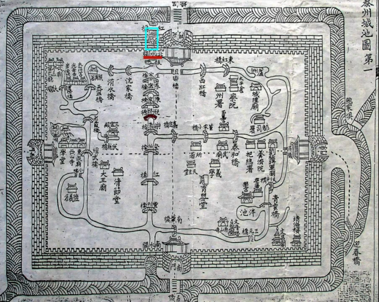 在市区人民东路与新民街交叉路口,一片层层叠叠垒砌成拱状的古代城砖清晰可见。经过现场勘验,确认为《泰州志》中所记载的城北水门遗址。
