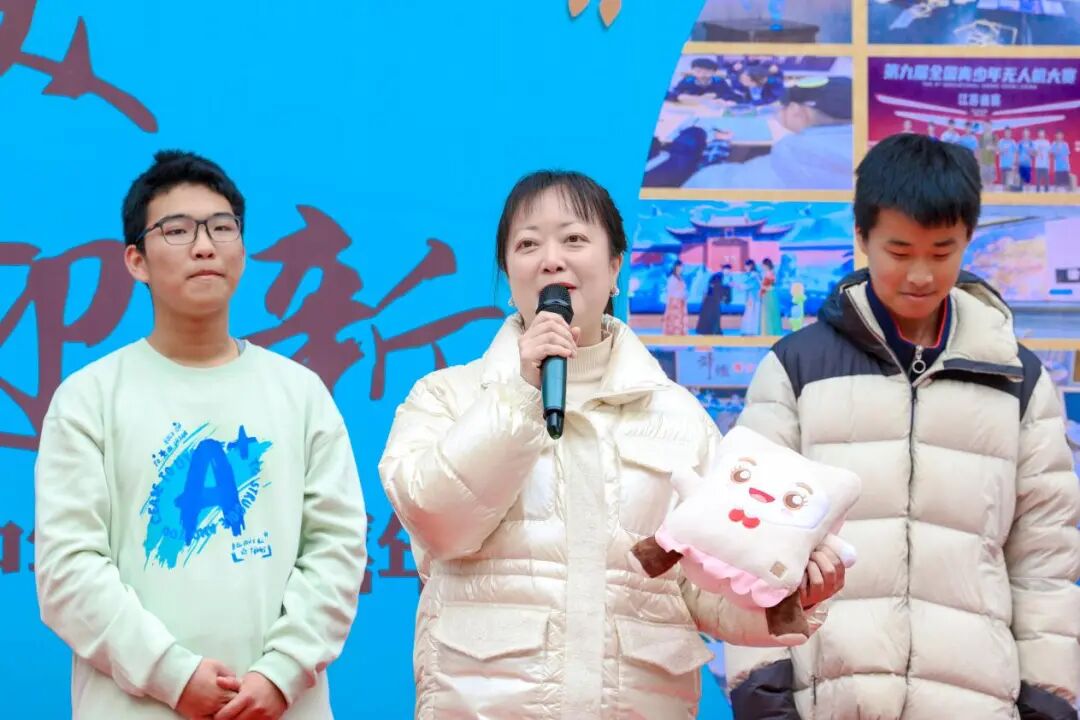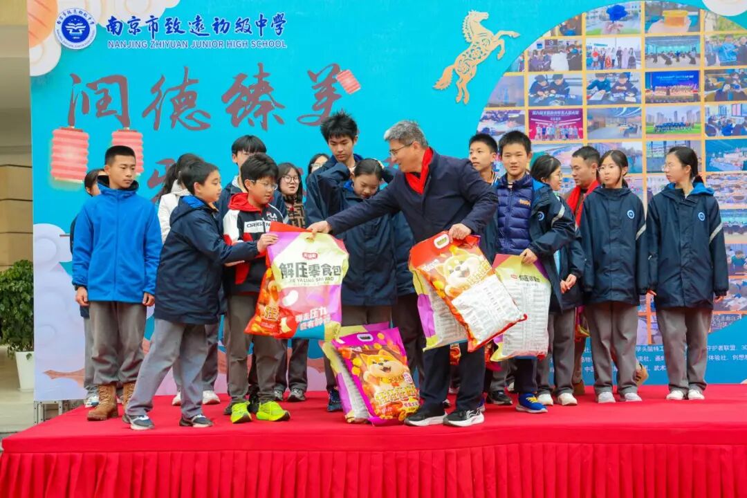 最后,五位校级领导登台致辞送福,为全体师生带来真挚的新年寄语与祝福,随即向全校各个班级发放了节日的大礼包,将全场气氛推向高潮。