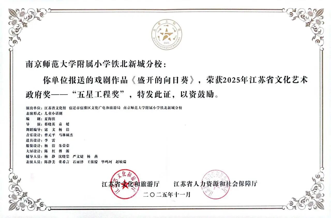 日前,备受瞩目的江苏省第十五届“五星工程奖”获奖名单正式揭晓。由南京市玄武区选送,南京师范大学附属小学铁北新城分校精心打造的原创儿童小话剧《盛开的向日葵》,在全省众多优秀群众文艺作品中脱颖而出,成功摘得江苏省群众文艺政府最高奖——“五星工程奖”的金奖。