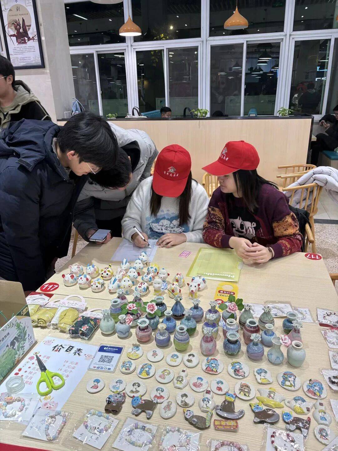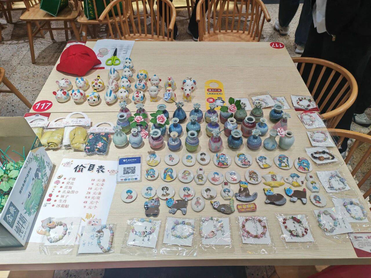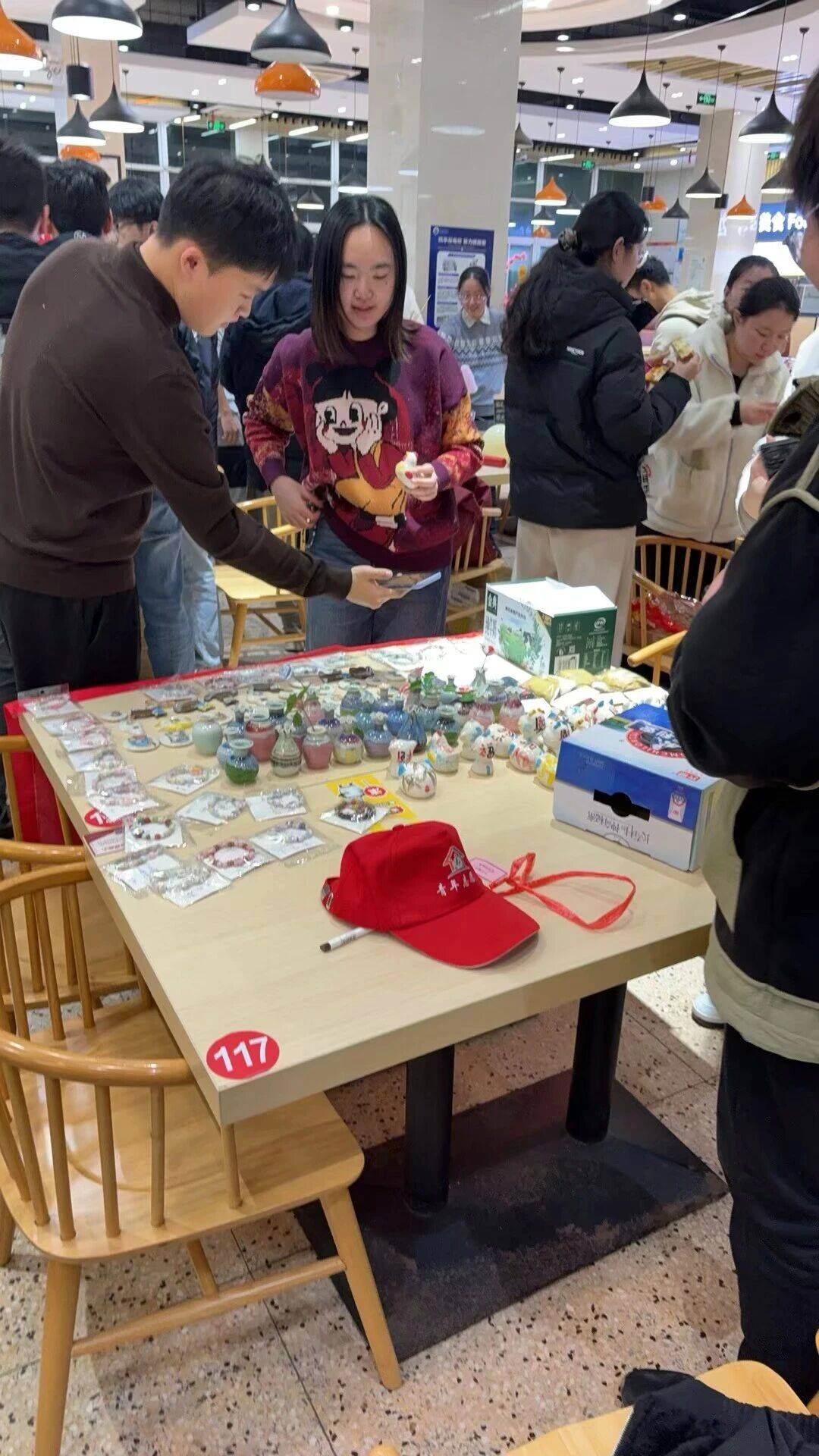 医学院食堂内的4个专属摊位早已准备好,整齐亮相,四位同学化身非遗宣传员与暖心摊主,对所有手作明码标价,耐心向来往师生讲述每一件作品背后的故事——是学员们反复打磨的坚守,是非遗技艺代代相传的初心,更是残障群体向阳而生的力量。来往师生纷纷驻足,在欣赏非遗之美的同时,用实际行动支持助残公益。有的学员一次性买下几件作品,打算赠予亲友传递这份温暖;不少同学拿出零花钱,挑选心仪的手作,只为献上一份绵薄之力。更有师生自发当起志愿者,帮忙吆喝宣传,让助残的暖流在校园里涌动。短短数小时,义卖摊位前始终人头攒动,一件件手作被爱心认领,一笔笔善款汇聚成河,成为市集上最亮眼的风景。