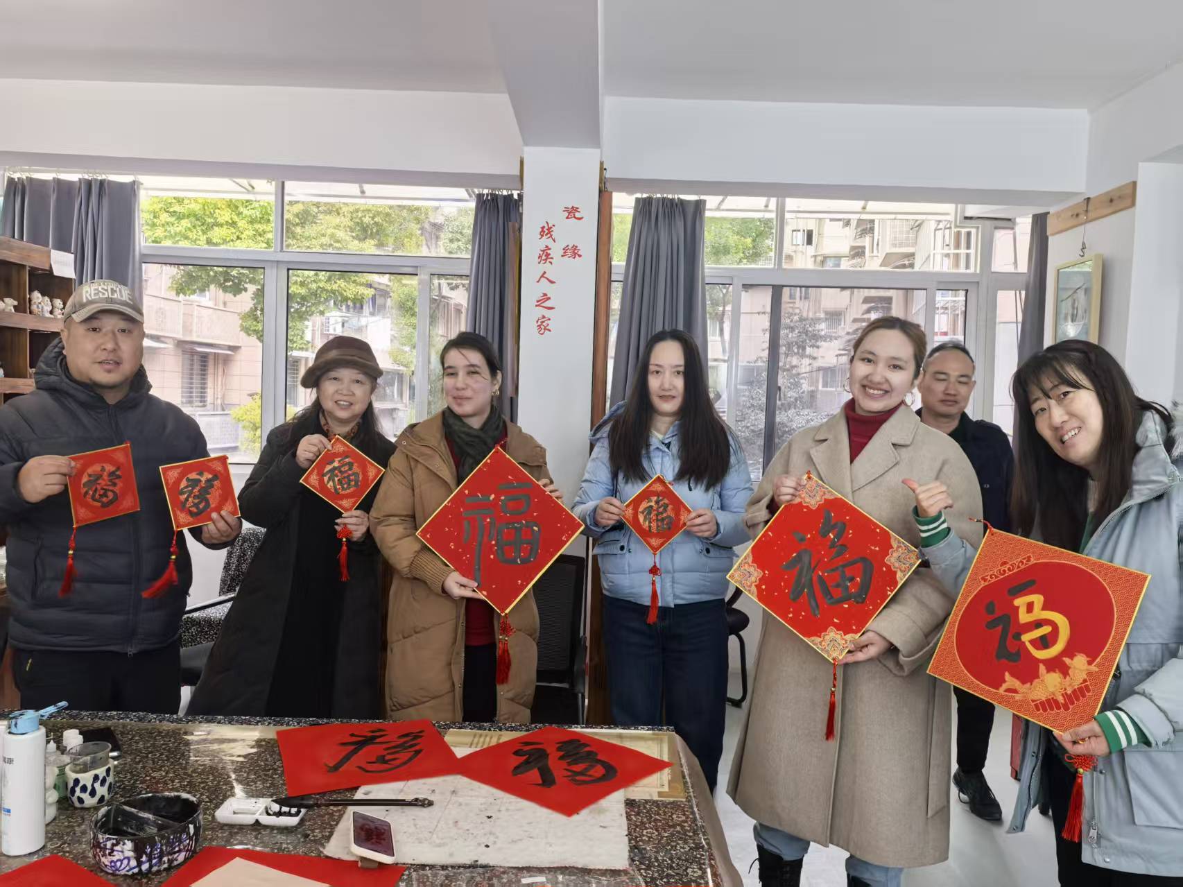 活动中,随行的外国友人也深度参与到新春民俗体验中,和学员们一起写福字,感受中国传统年俗文化。学员们不仅向外国朋友赠送了亲手书写的福字与对联,还送上了精心制作的十二生肖手工作品,以独具心意的文创礼物传递新春祝福,让中外文化在温馨互动中交融共鸣。收到这份特别的礼物,外国友人爱不释手、连连称赞,脸上洋溢着开心的笑容。大家围坐交流、携手互动,机构工作人员也向志愿者、老师和外国友人详细介绍了瓷缘残疾人之家的服务项目与日常开展的特色活动,让更多人了解、关注助残公益事业。
