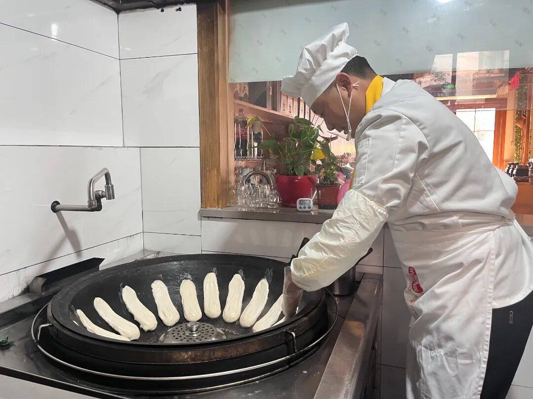 在李文山看来,非遗从不是束之高阁的藏品,而是融入日常的生活方式。十五六岁起,他便跟着父亲学习面点手艺,二十余年来坚守手工制作、拒绝工业化量产,吃透老面发酵、火候把控等工艺精髓。在继承祖辈配方与工序的基础上,他不断改良创新,让传统锅巴馍适配现代口味,成为老少皆宜的人气美味。做馍无捷径,从凌晨备面起便不停歇出餐,每个环节亲力亲为,是祖辈传下的规矩,更是他坚守的非遗底线。新春期间,李氏锅巴馍更是供不应求。这道美食,曾因耐存放、易携带,成为当地人外出谋生的干粮,见证着这片土地上人们的踏实肯干、勇于开拓;如今,它是春节家宴、亲友小聚的桌上常客,是游子归乡必尝的家乡味,更成为盘城文旅融合、特色美食产业发展的重要载体。