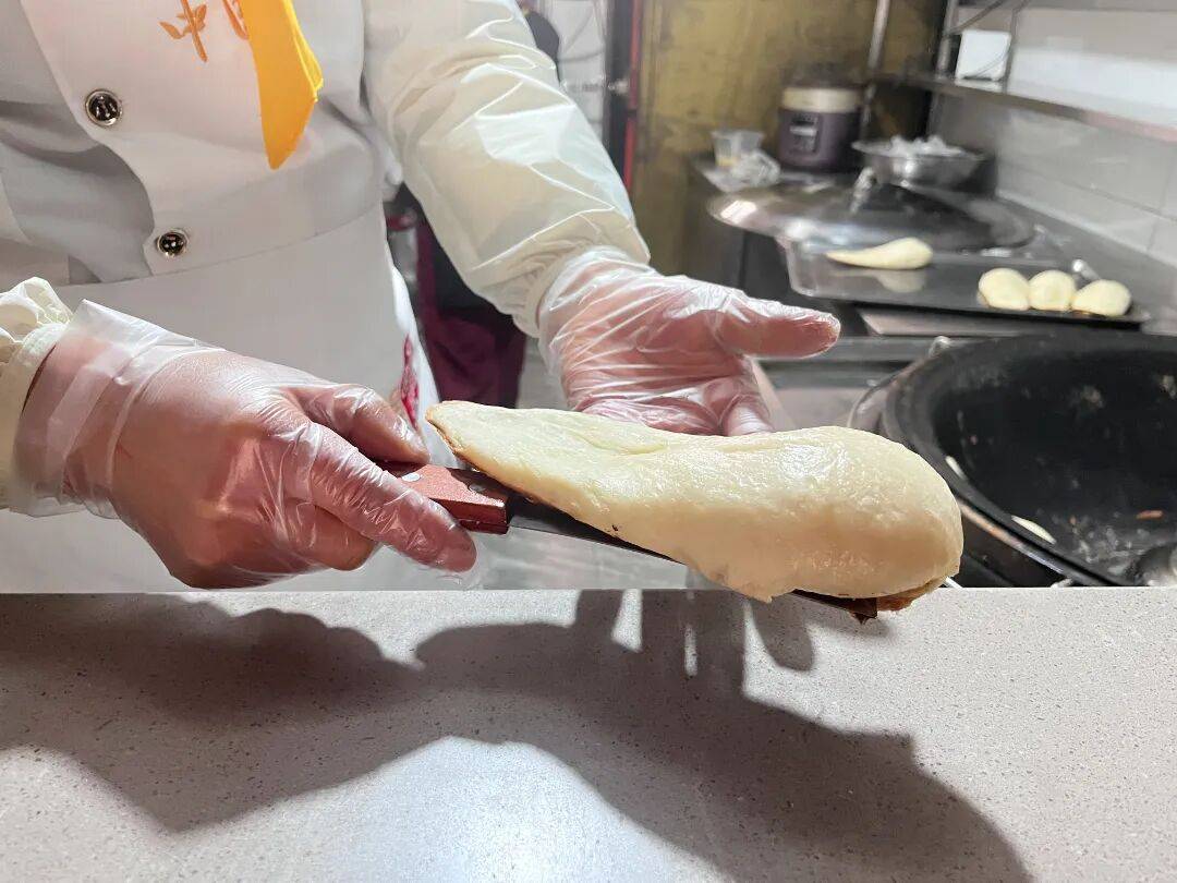 “做馍先守心,手艺传三代,更要传匠心。”在盘城新街“菜园子”饭店,李氏锅巴馍第四代传承人李文山,正在后厨娴熟地揉面、塑形、上锅,片刻功夫,一锅热气腾腾的锅巴馍便新鲜出炉,一面焦脆一面松软,香气扑鼻、惹人垂涎。作为非遗美食,李氏锅巴馍的制作堪称一门手艺活:全程不用碱、不添苏打,仅靠老面自然发酵,醒面、揉面、醒发、塑形每一步皆循古法;更以锅贴煎制工艺打造鸭舌状外形,将手工温度与祖传配方,尽数揉进浓浓年味,造就了区别于传统馒头的独特口感。