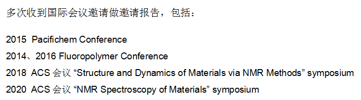 博士求学期间,她的学术成就备受瞩目:2009年,她凭借在核磁共振领域的出色研究,荣获Dr.G.E.Wilson and M.P.Wilson NMR Award核磁奖;2010年,她又斩获美国国家化学学会“高分子学科卓越研究生奖”,并受邀担任国际小分子核磁年会(SMASH)研究生及博士后分会主席,以卓越的专业能力赢得了国际同行的广泛赞誉。